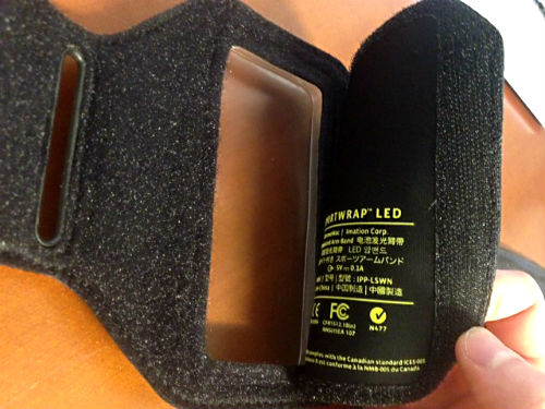 XtremeMac Sportwrap LED är gjort i nepren/lycra med kardborresfäste och två spännen. Du stoppar in din iPhone 5 genom att dra bort kardborreluckan på baksidan (se bild).
