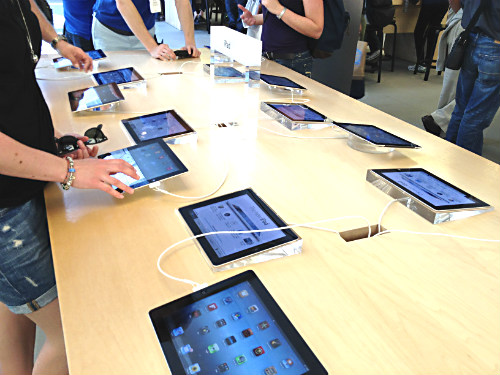 Väl nere i butiken finns samtliga Apple-produkter representerade vid olika små bord där du kan prova dem. Nedan har ni en bild på iPad-bordet. Det finns även ett lägre bord för barn som var helt tomt, det här stället är inte särskilt barnvänligt med tanke på att det nästan alltid är fullt med folk.