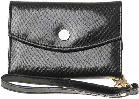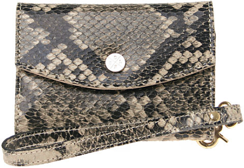Saddler Larsen Wallet är gjord i äkta läder, och finns i två utföranden: ett med ormskinnsmönster och ett svart med mönstrat läder. Båda har gulddetaljer och en kuvertliknande design med en snygg knapp med Saddlers logo på.